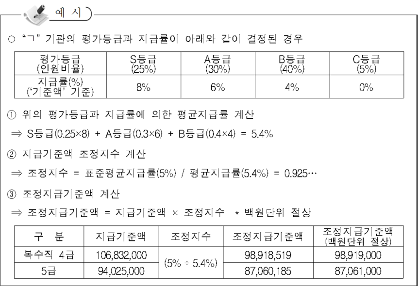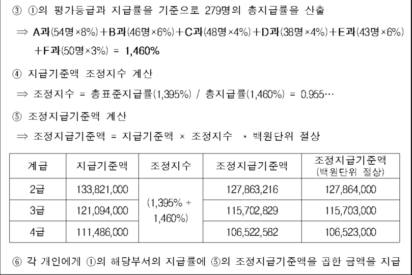 다만, 개인별 평가등급 인원이 조정될 경우에는 평가등급에 해당하는 지급률에 조정지급기준액을 곱한 금액으로 한다.
